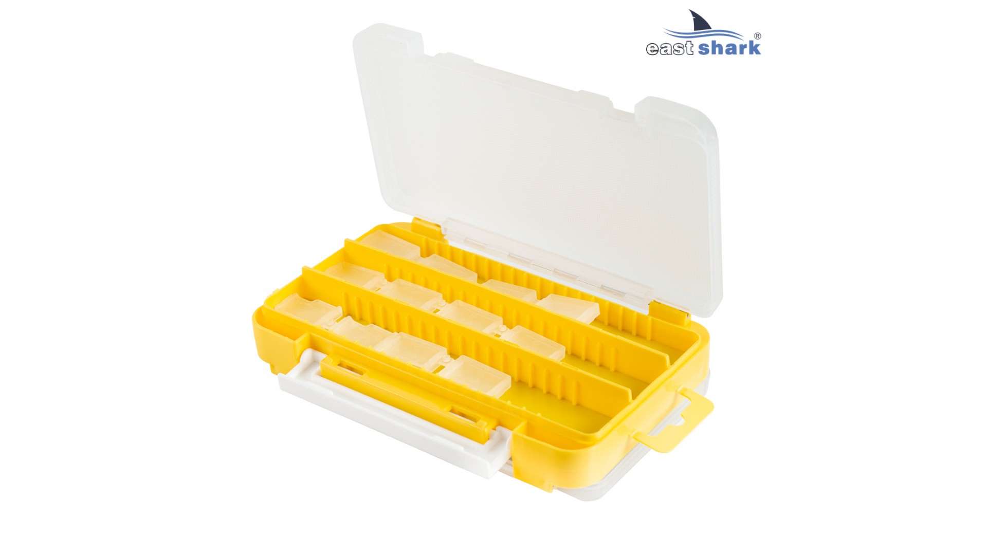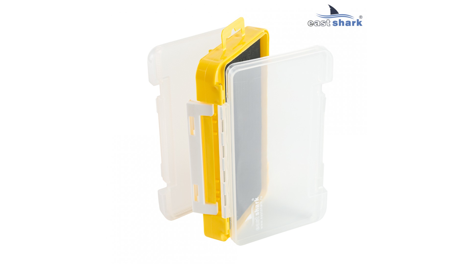 Коробка 2-х сторонняя, имеет несколько отсеков с разделителями для хранения рыболовных аксессуаров и приманок с одной стороны, и пористый вкладыш с прорезями для фиксации крючков приманок с другой стороны.