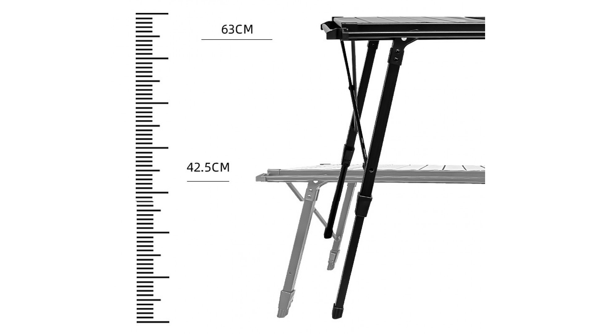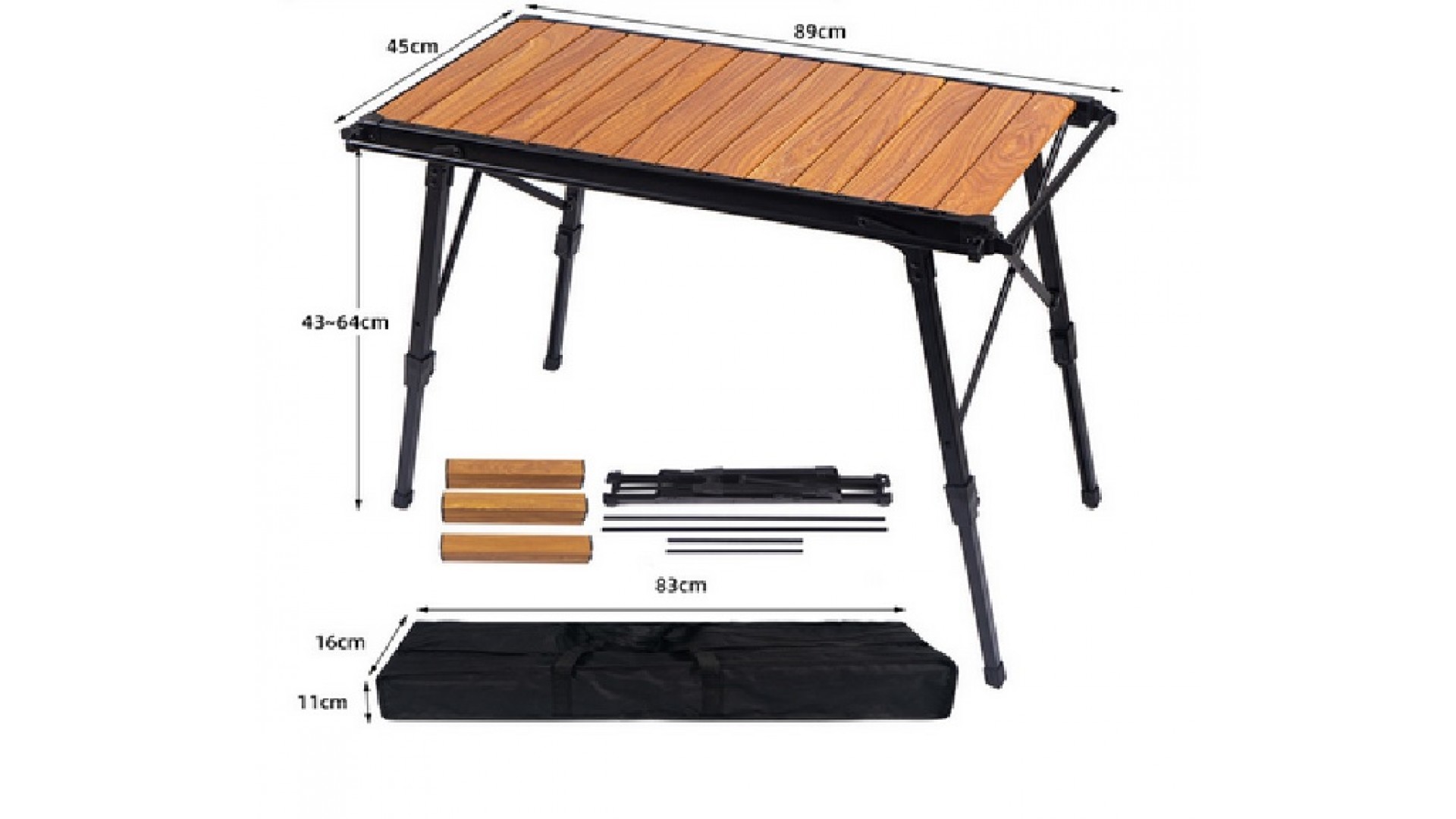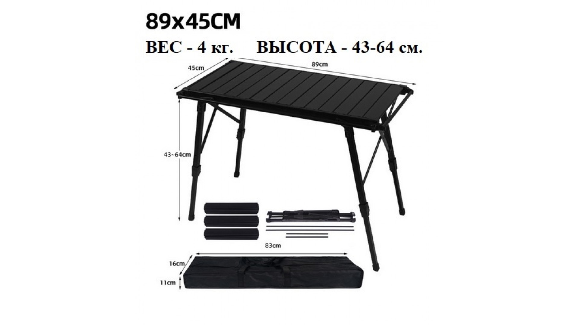 - Размеры стола в развернутом виде: 89х45х43-64 см.