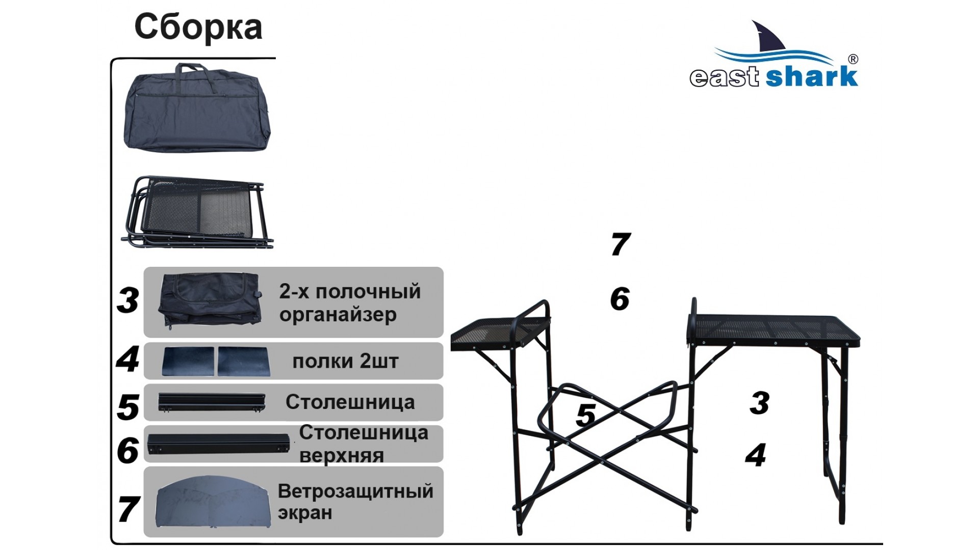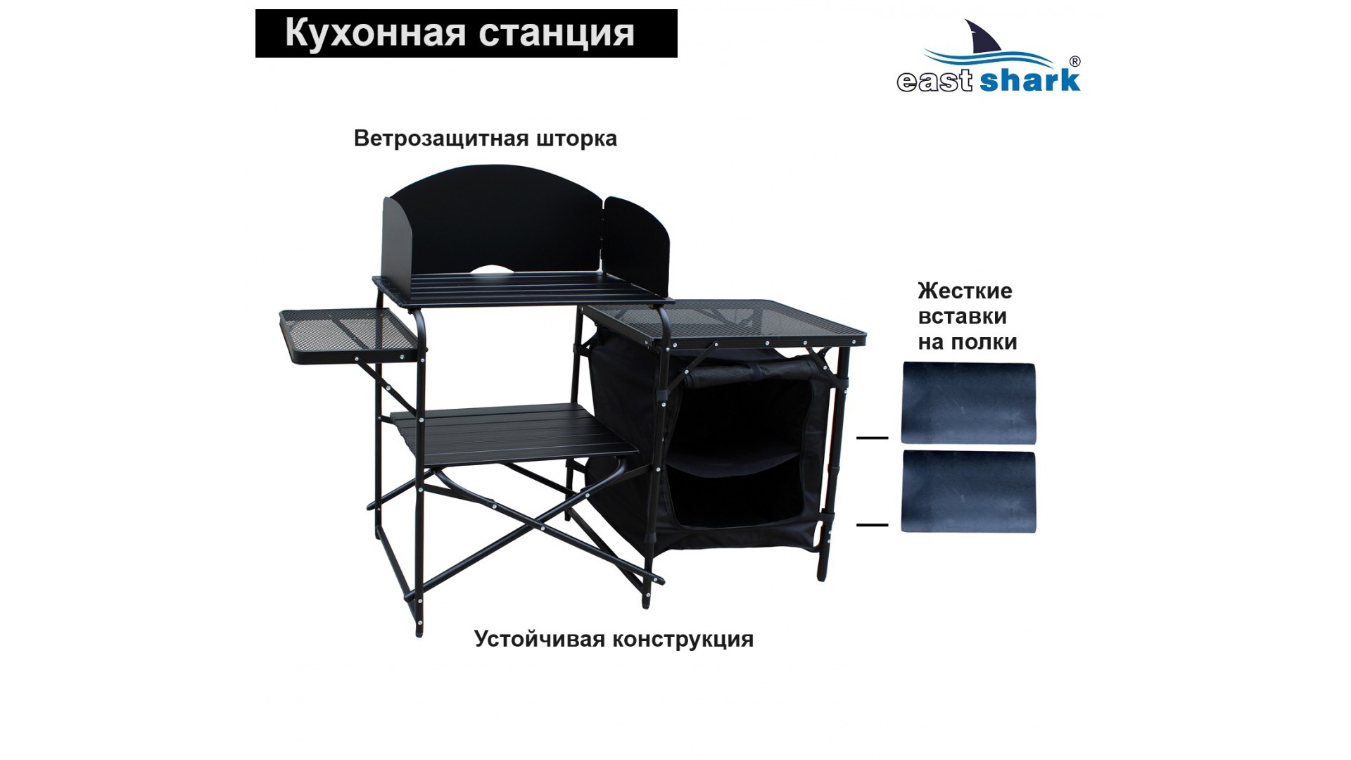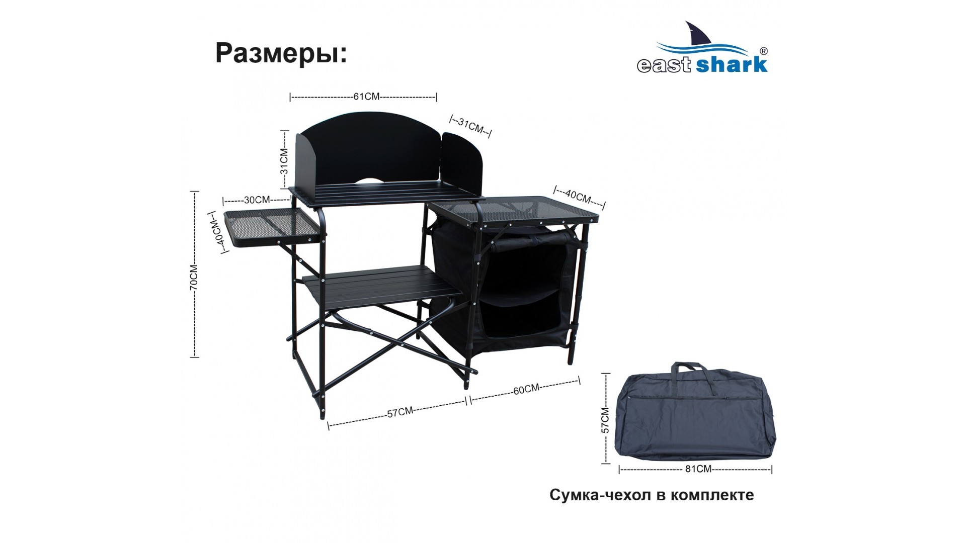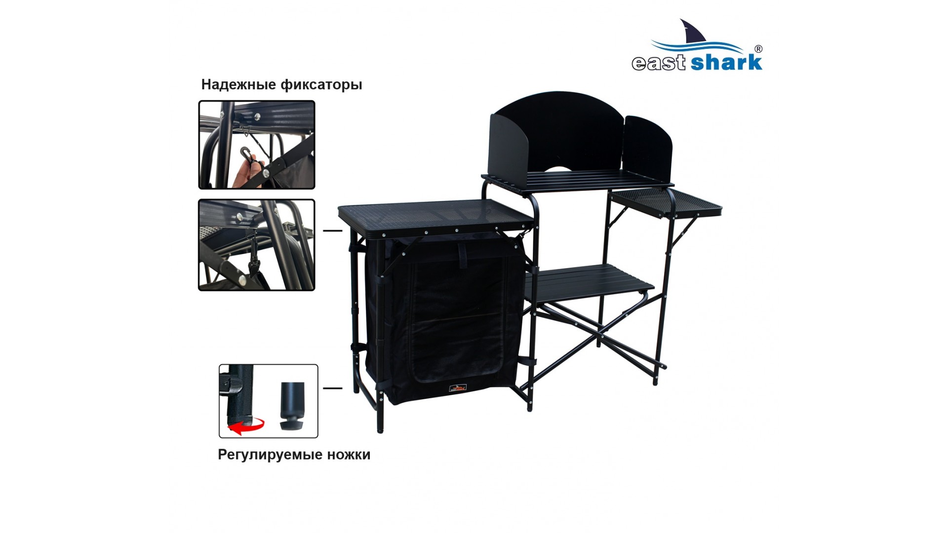 Станция предназначена для хранения столовых принадлежностей и приготовления пищи на природе, при этом он отлично подходит для хранения рыболовных принадлежностей и аксессуаров во время длительных рыболовных сессий, позволяет сэкономить много места в палатке!