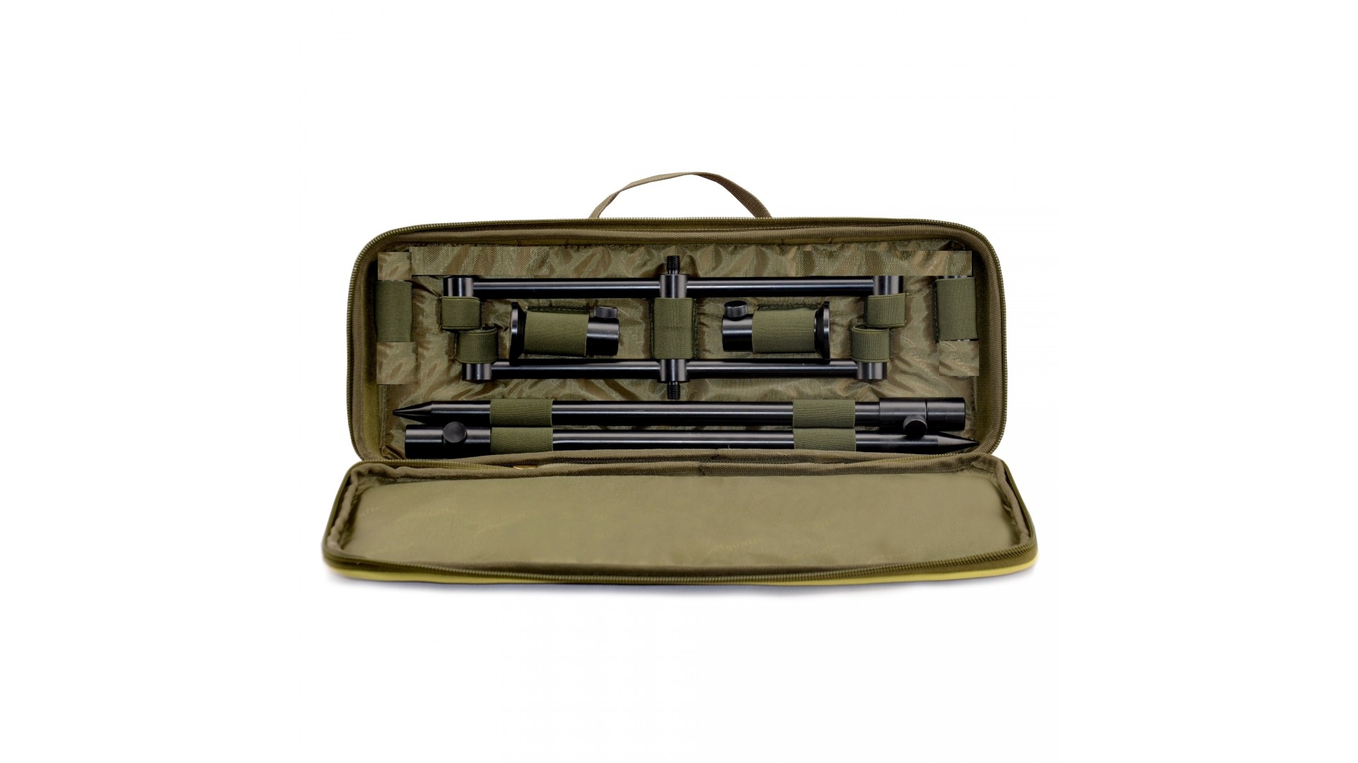 Передний буз бар и задний бузбар рассчитан на крепление 2-х держателей комелей. Увеличенный диаметр стоек, который составляет 1,5 см позволяет зафиксировать удилища в сыпучем грунте более надежно, а в совокупности с буром, позволяет вкручивать стойку и в плотный грунт. Качественное чёрное матовое покрытие защищает поверхность стоек, сделанных из алюминиевого сплава.