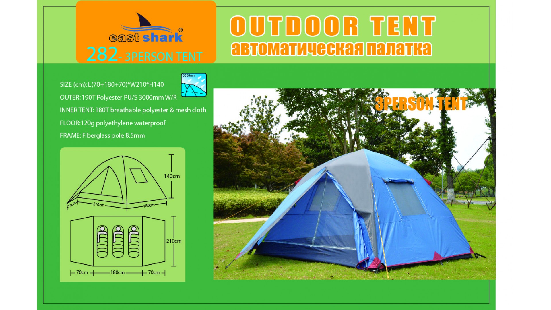 Ткань тента: 190T POLYESTER (полиэстер) PU3000MM B/H