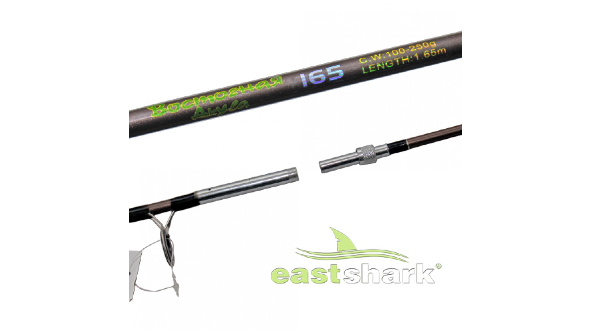 Спиннинг стеклопластиковый Восточная акула с прикручивающимся складом. Тест 100-250 грамм, длина от 1,65 до 3 метров.